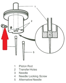 7) Examiner l'état de l'aiguille. Si celle-ci doit être remplacée, desserrer la vis située sur le boisseau et retirer l'aiguille. Si elle ne peut pas être ôtée facilement, l'enfoncer dans le boisseau pour la dégripper. Ensuite, la tirer vers l'extérieur. Veiller surtout à ne pas la plier ou la marquer. Toute déformation même infime de l'aiguille impliquera son remplacement.